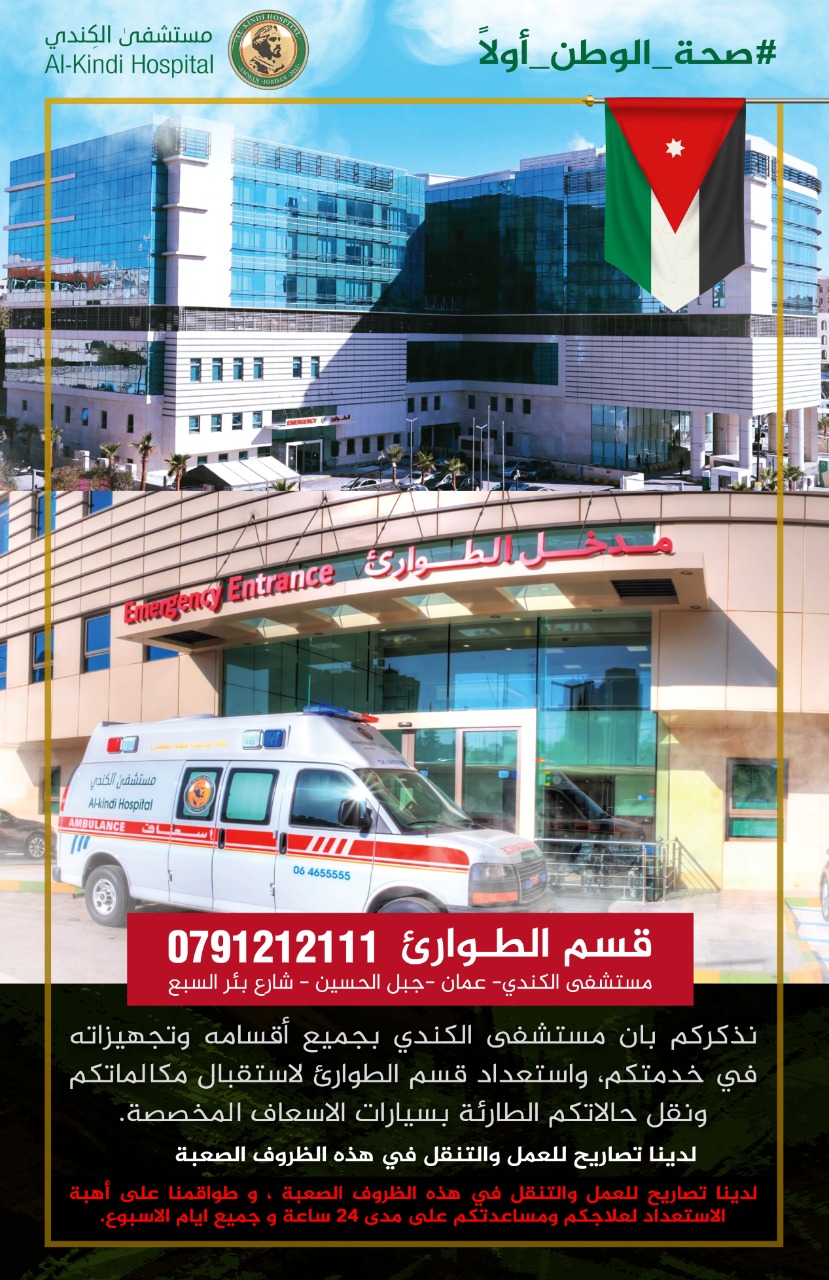 سرايا - اعلن مستشفى الكندي استعدادته لتقديم الخدمات الطبية والعلاجية للمواطنين في هذه الظروف الاستثنائية التي تعيشها المملكة ، جراء ازمة فيروس كورونا .