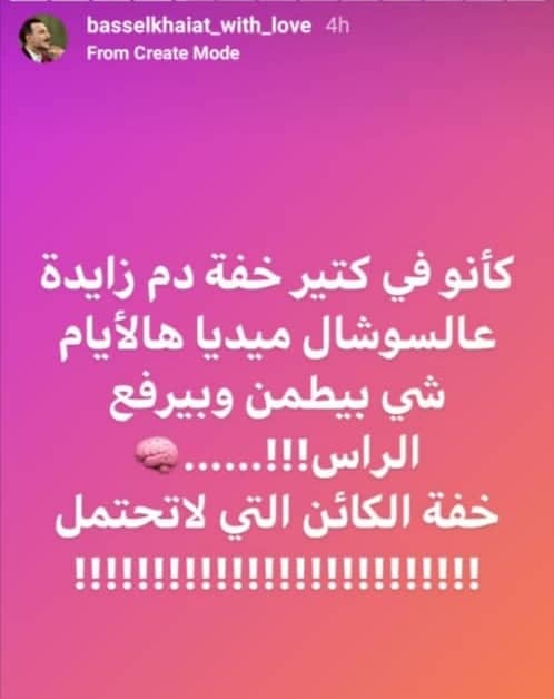 سرايا - انتقد الممثّل باسل خياط عبر حسابه على "إنستغرام" موجة السخرية والمزاح التي قال بأنها تتزايد بالفترة الأخيرة عبر مواقع التواصل الاجتماعي، قائلا إن هذا الأمر لا يحتمل أبدا، فكيف يمكن تناوله بهذا الاستهزاء.