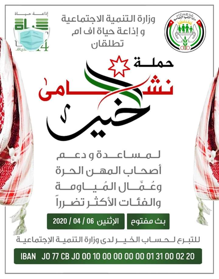 سرايا - تطلق وزارة التنمية الاجتماعية وإذاعة حياة اف ام الاثنين المقبل حملة نشامى الخير لمساعدة ودعم اصحاب المهن الحرة وعمال المياومة والفئات الأكثر تضرراً والذين يعتمد قوت يومهم على دخلهم اليومي.