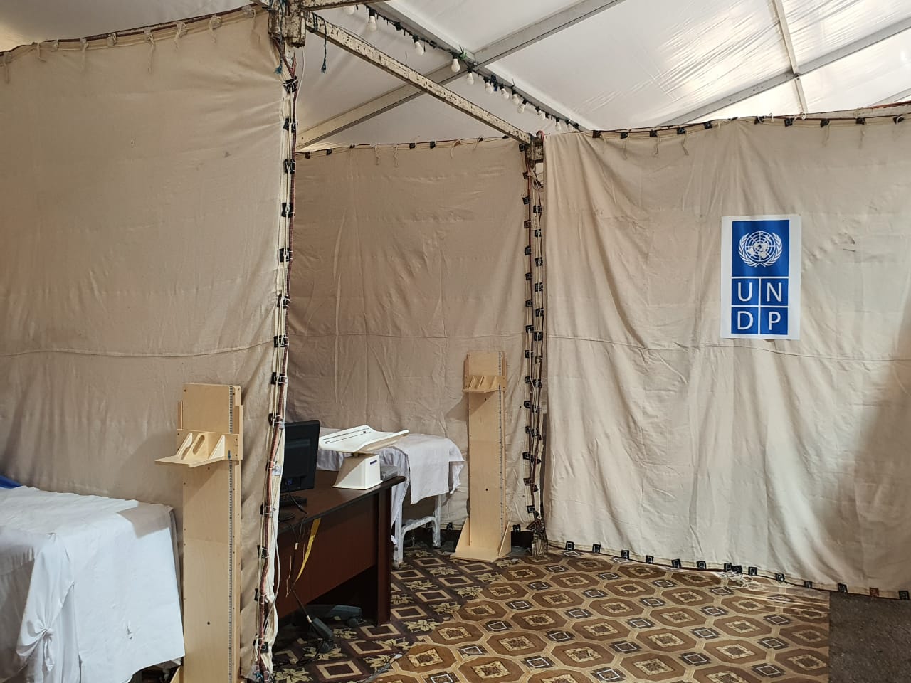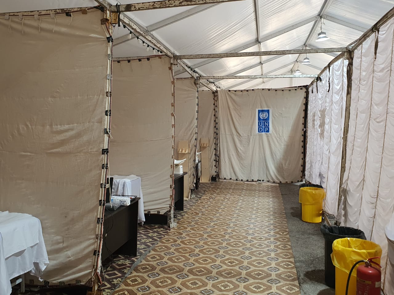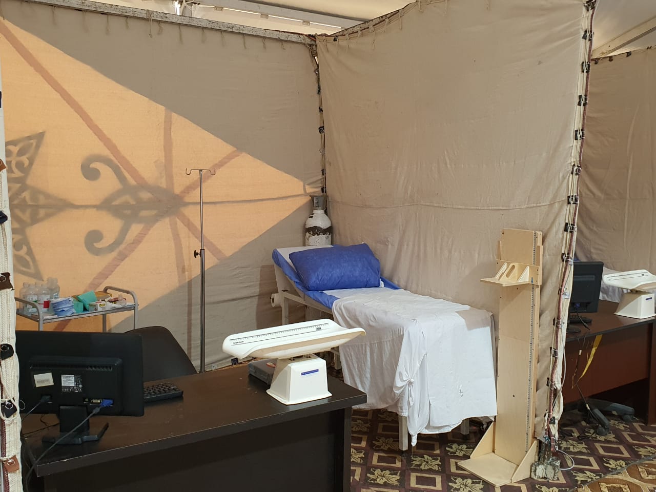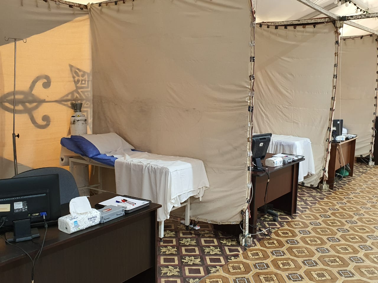 وتم انشاء الخيمة الطبية الميدانية على مساحة ٥٠٠ متر مربع مجهزة بأحدث التقنيات الفنية الخاصة والكواد البشرية المؤهلة ، وتشتمل الخيمة على عشرة اقسام لمختلف التخصصات وتتمثل آلية عمل الخيمة باستقبال المرضى وتصنيفهم وتحويلهم الى اقسام الاختصاص لتخفيف الضغط على قسم الطوارئ والإسعاف خاصة في هذه الظروف.