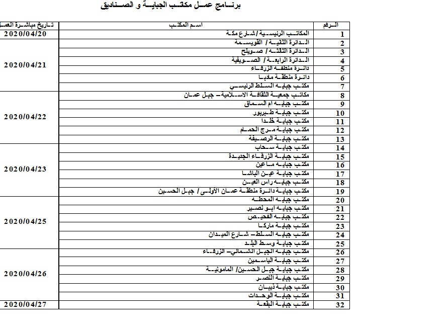25/ 4: مكتب جباية المحطة، مكتب جباية ابو نصير، مكتب جباية الفحيص، مكتب جباية ماركا، مكتب جباية السلط شارع الميدان، مكتب جباية وسط البلد