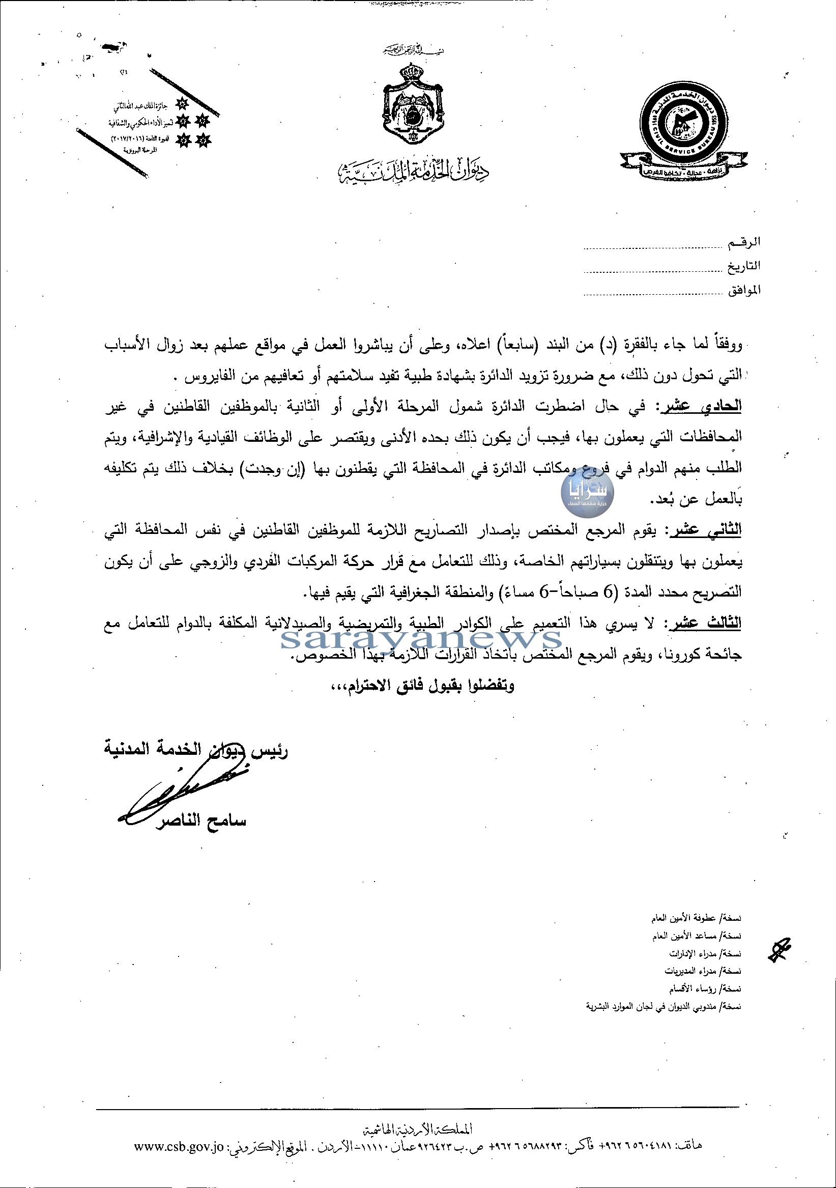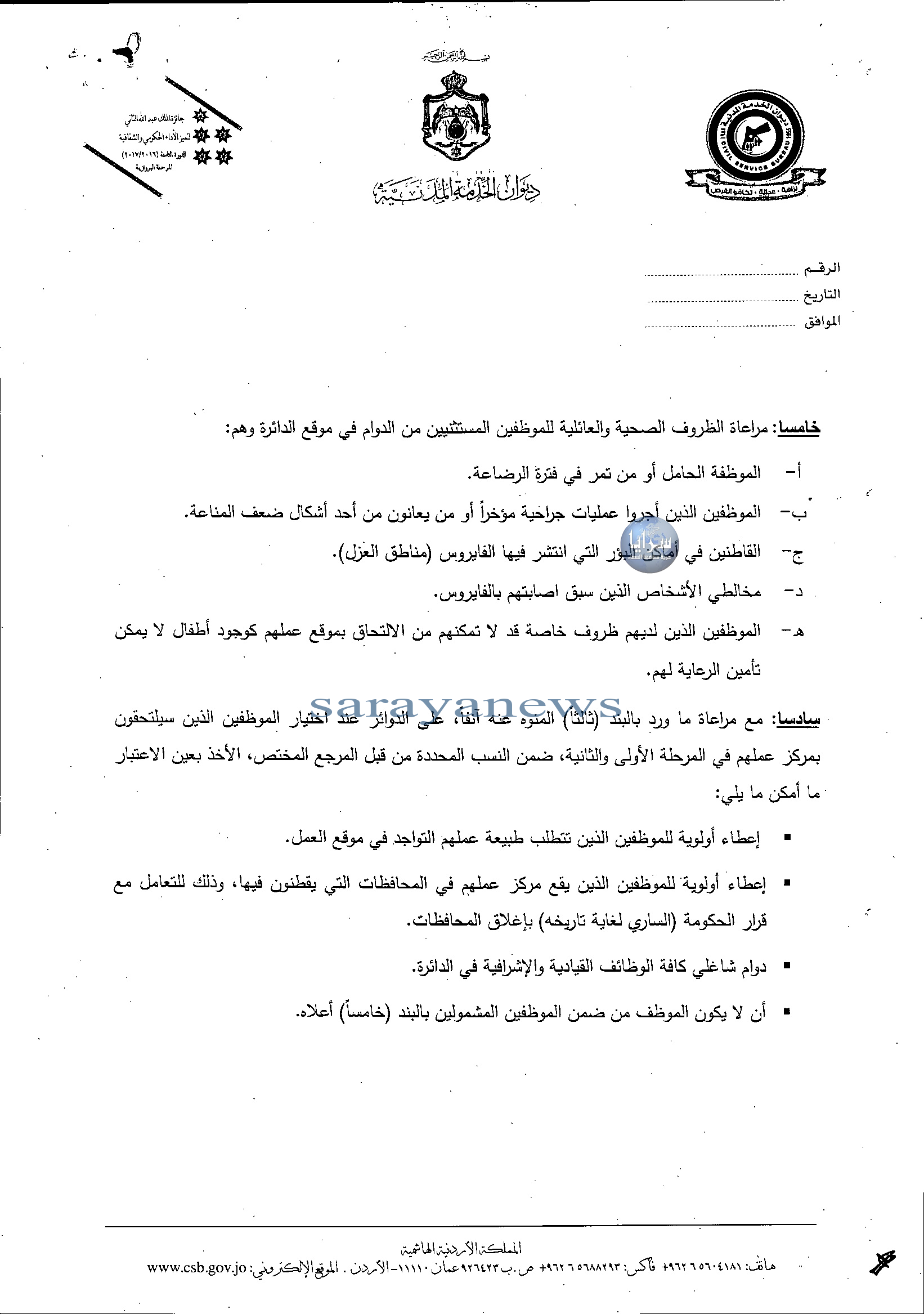 يذكر أن الحكومة أعلنت عن ساعات الدوام الرسمي أمس، ويجوز للمرجع المختصّ في المؤسّسة أو الدائرة الحكوميّة تعديل ساعات الدّوام بحسب ما يراه مناسباً، والأولويّة في الدوام للموظفين القاطنين في نفس المحافظة، وفي حال تطلّبت احتياجات العمل ضرورة وجود موظفين من محافظات أخرى، سيتمّ إصدار تصاريح لهم من خلال الوزير أو المرجع المختصّ.