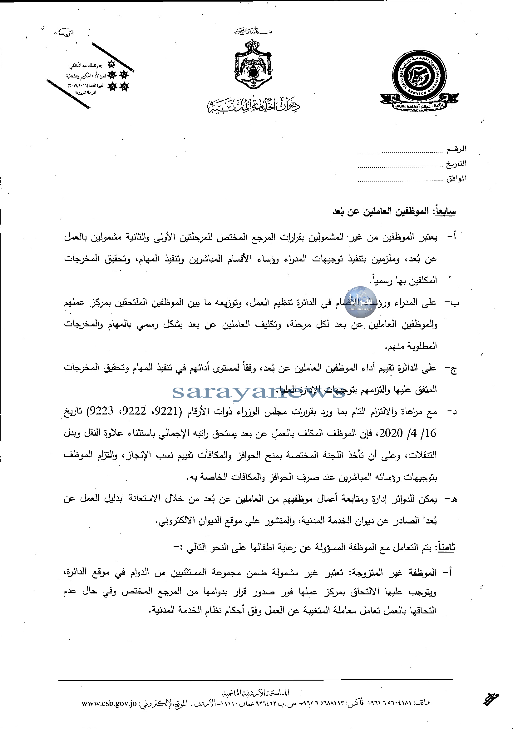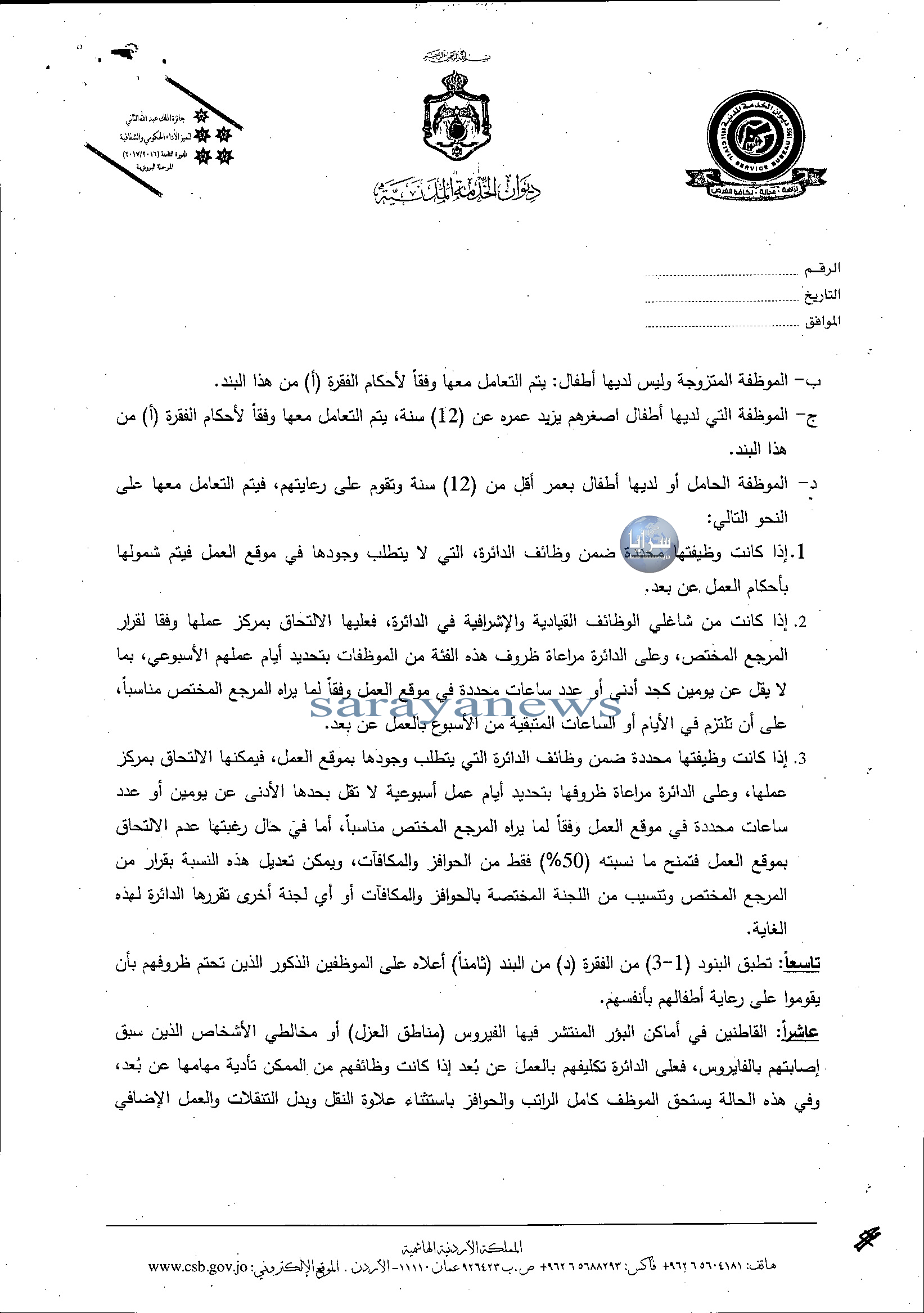 رئيس ديوان الخدمة المدنية سامح الناصر قال لـ"سرايا"، أن هناك دليل إرشادي أعلنت عنه الحكومة قبل أسبوع تقريباً يخص الأم التي لديها أطفال أعمارهم أقل من 12 عاماً و تقوم على رعايتهم، في ظل عدم توجه إعادة فتح دور الحضانات.