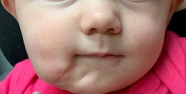 ورغم عدم معاناة الرضيعة من أي أضرار نتيجة هذا التشوه الخلقي، رأى الأطباء ضرورة إجراء عملية لإزالته، وبعد مرور 6 أشهر، بدت الطفلة في حالة تعاف ولم تتأثر تقريبا، لم تعاني سوى بعض التورم وعيب عصبي بسيط في شفتها السفلية.