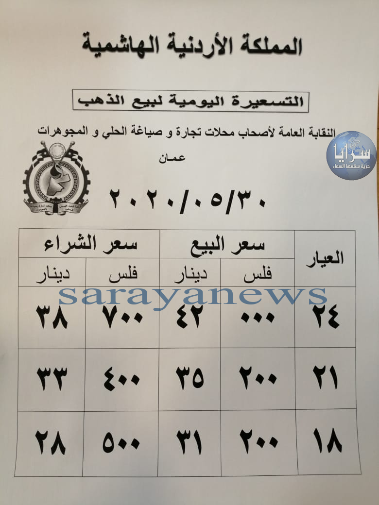 وبحسب التسعيرة اليومية التي تصدرها النقابة العامة لأصحاب محلات تجارة و صياغة الحلي والمجوهرات، فقد بلغ سعر بيع الغرام من الذهب عياري 24 و18 لغايات الشراء من محلات الصاغة عند 42 دينارا و31.200 دينارا.