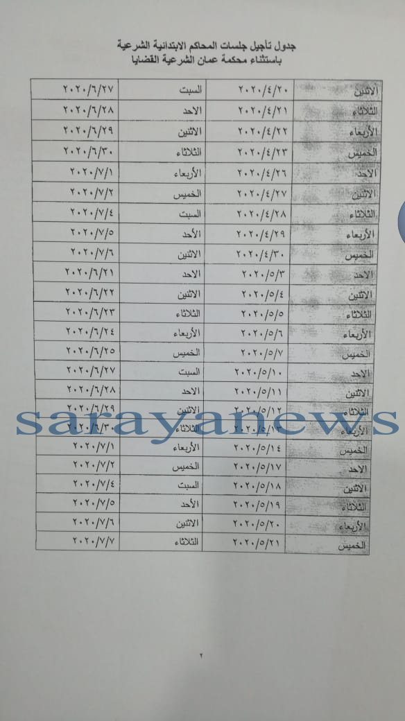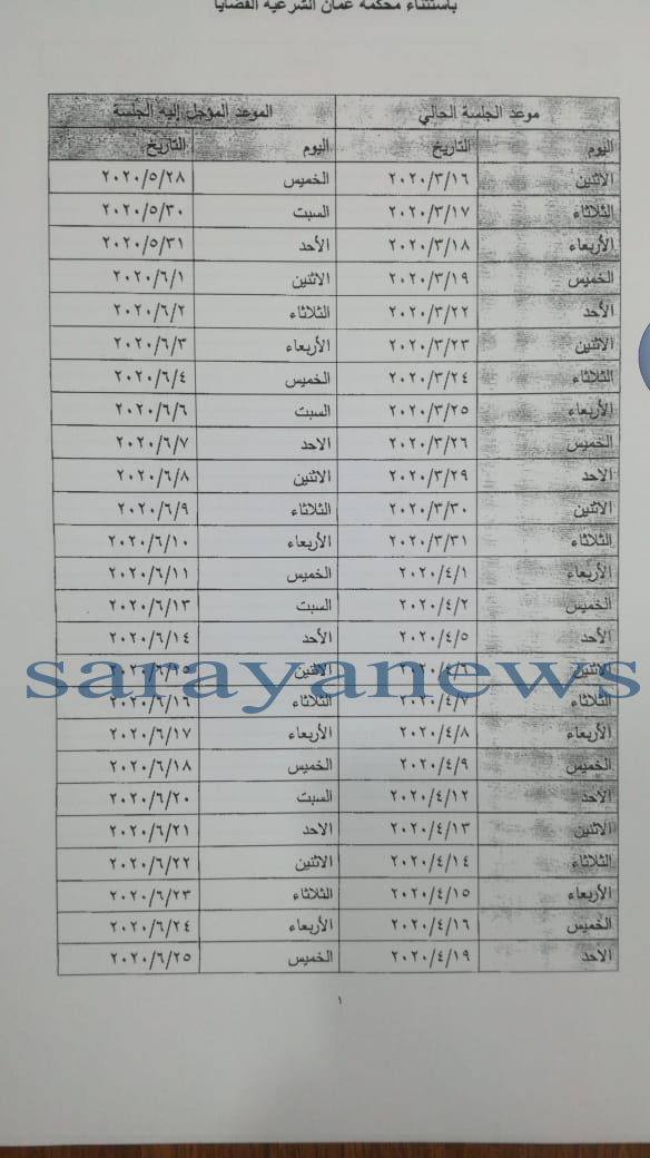 سرايا - عمم سماحة قاضي القضاة على جميع المحاكم الشرعية بالنظر في الدعاوى التي صادف موعد النظر بها خلال اشهر حظر التجول لمواجهة جائحة فايروس كورونا وفق المواعيد المبينة بالجدول أدناه .
