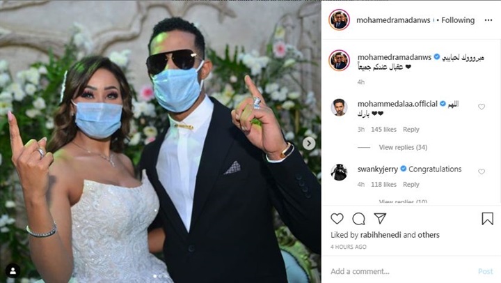 وظهر "رمضان" برفقة زوجته وهو يلتقط الصور التذكارية مع شقيقته وزوجها بـ "الكمامات" كإجراء احترازي لعدم الإصابة بفيروس كورونا، وذلك بعدما تعرض لموجة كبيرة من الانتقادات لإقامة حفل زفاف في ظل الظروف الصعبة التي تمر بها البلاد وقرار ومخالفتة لتعليمات الدولة بقرار عدم التجمعات.