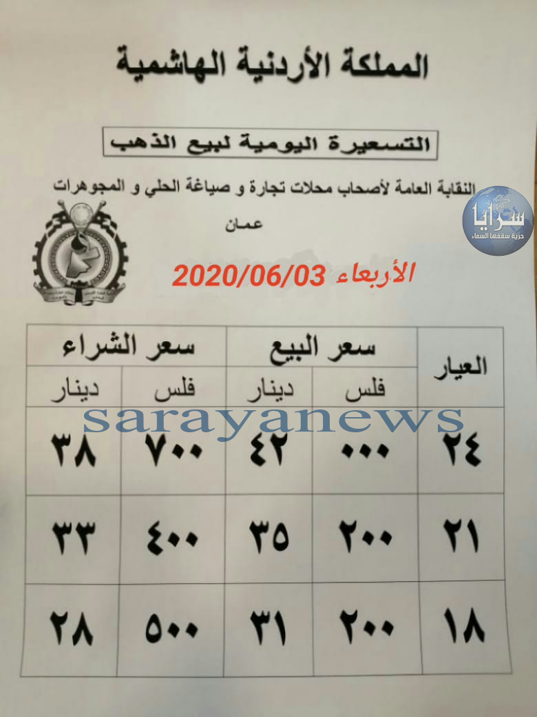 وبحسب التسعيرة اليومية التي تصدرها النقابة العامة لأصحاب محلات تجارة و صياغة الحلي والمجوهرات، فقد بلغ سعر بيع الغرام من الذهب عياري 24 و18 لغايات الشراء من محلات الصاغة عند 42 دينارا و31.200 دينارا.