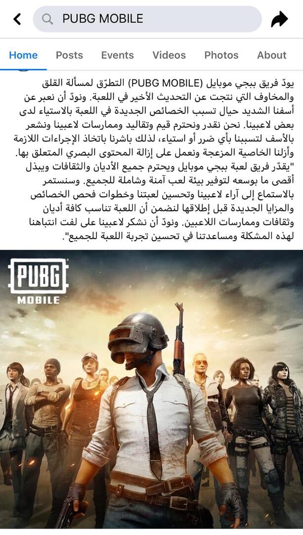 وكتب فريق اللعبة عبر الصفحة الرسمية بموقع "فيس بوك": "يود فريق ببجي موبايل (PUBG MOBILE) التطرق لمسألة القلق والمخاوف التي نتجت عن التحديث الأخير في اللعبة".