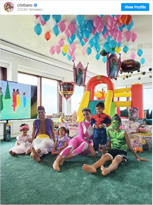 وظهر رونالدو وعائلته في الصورة متنكرين، كل منهم بشخصية كرتونية وخيالية شهيرة، واختار النجم البرتغالي تقمص شخصية علاء الدين الكرتونية وارتداء لباسه الشهير.