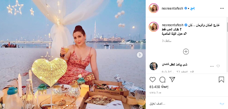 وظهرت نسرين وهي تجلس وسط مائدة وانوار مضئية علي الرمال وخلفها البحر مع عائلتها او صديقاتها ويرتدين الكمامات، كما ارتدت نسرين فستان كت منقوش طويل مناسب لاطلالاتها علي البحر .