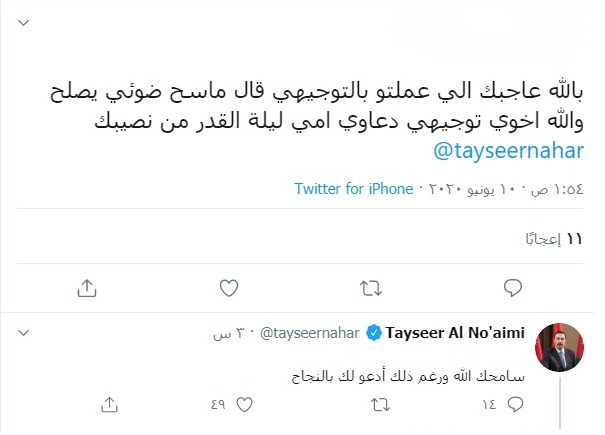 و قالت المتابعة للنعيمي: "بالله عاجبك إلي عملته بالتوجيهي، قال ماسح ضوئي يصلح، والله أخوي توجيهي و دعاوي إمي بليلة القدر كانت من نصيبك."