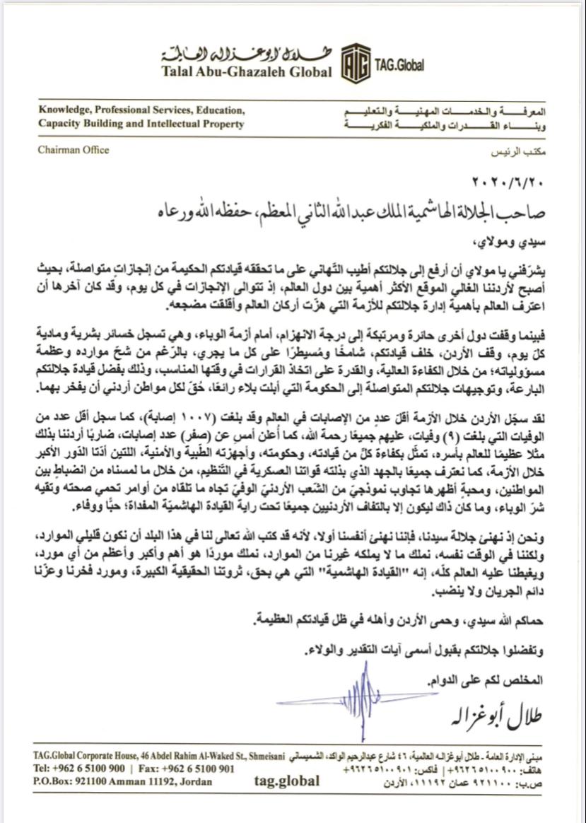 سرايا - رفع الدكتور طلال ابو غزالة رئيس مجلس ادارة مجموعة طلال ابو غزاله العالمية رسالة شكر وتقدير الى جلالة الملك عبدالله الثاني بن الحسين على ما حققته وتحققه قيادة الملك الحكيمة من انجازات كان اخرها اعتراف العالم بأهمية ادارة الملك لأزمة كورونا التي هزت اركان العالم