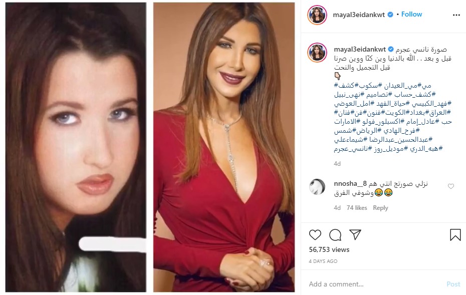 وهذه المرة نشرت مي العيدان صورة عبر حسابها على "انستجرام" اعتبرها البعض "مهينة" للفنانة اللبنانية نانسي عجرم، حيث ظهرت صورة قديمة بجوار صورة حديثة وعلقت عليها ساخرة بالقول :" صورة نانسي عجرم قبل وبعد . . الله بالدنيا وين كنّا ووين صرنا قبل التجميل والنحت".