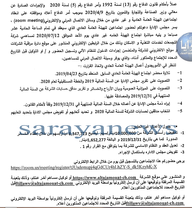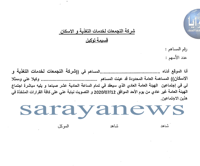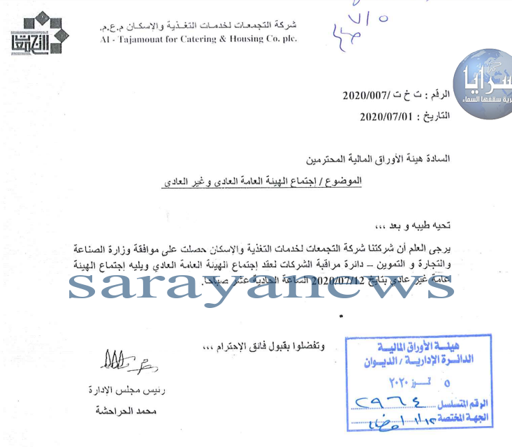 سرايا - قررت شركة التجمعات لخدمات التغذية والاسكان تخفيض رأس مالها من 10 مليون دينار لغاية 8347723 دينار.