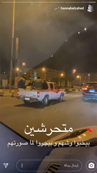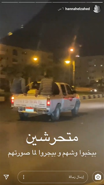 ونشرت الفنانة هنا الزاهد، عبر ستورى حسابها بموقع إنستجرام، فيديوهات خلال ملاحقتها لسيارة نصف نقل، وعلقت قائلة: "متحرشين بيخبوا وشهم وبيجروا لما صورتهم".