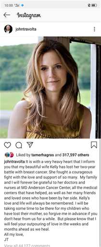 وعبر حسابه الرسمي على موقع وتطبيق Instagram أعلن ترافولتا وفاة كيلي بكلمات حزينة ومؤثرة، إذ نشر صورة لها وعلق عليها كاتباً:"أنه من الصعب أن أعلن أن زوجتي الجميلة كيلي خسرت معركتها التي استمرت عامين مع السرطان".