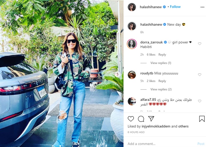 ونشرت "حلا"، صورًا جديدة لها عبر حسابها الرسمي على موقع "انستجرام"، وظهرت فيهم وهي ترتدي ملابس كاجوال عبارة عن بنطلون جينز وقميص يشبه ملابس "الصاعقة" ذات اللون الزيتي.