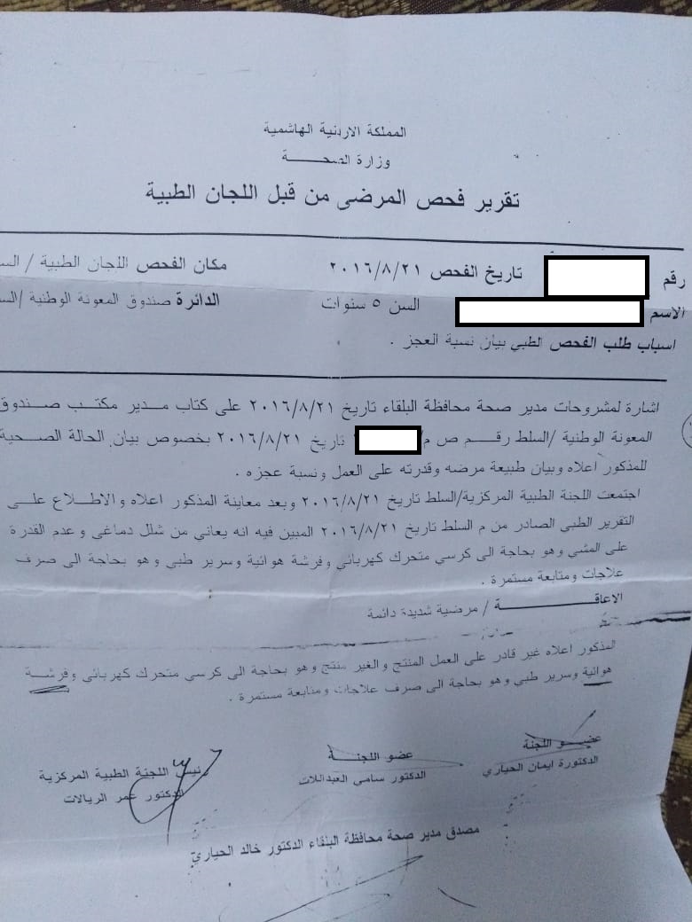 ويظهر التقرير الطبي الذي صرفته اللجنة اللوائية أنه بحاجة ماسة الى كرسي متحرك وفرشة هوائي وسرير طبي متحرك، وهو ما يفوق قدرة والدته بجميع الظروف.