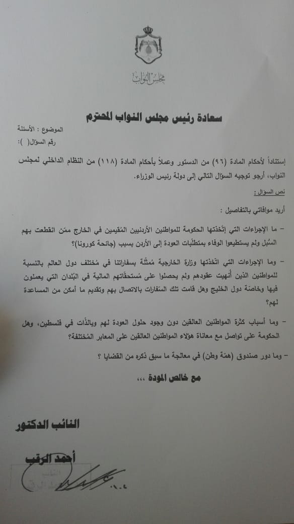 سرايا - وجه النائب احمد الرقب سؤالا نيابيا لرئيس الوزراء الدكتور عمر الرزاز يستائل فيه عن الاجراءات التي اتخذتها الحكومة للمواطنين الاردنيين المقيمين في الخارج ممن تقطعت بهم السبل ولم يستطيعوا الوفاء بمتطلبات العودة .