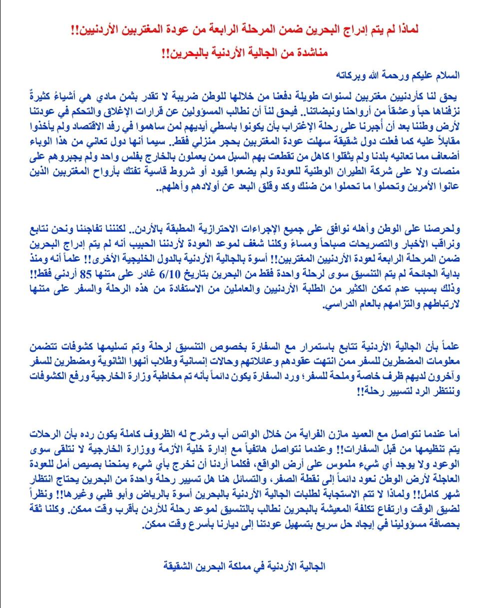 وقال عدداً من الأردنيين المقيمين في دولة البحرين أن الأردن لم تسير سوى رحلة واحد كانت اليوم وأغلبهم يحملون الجنسية البحرينية، مؤكدين بأنه تم تسليم السفارة في البحرين كشوفات الأردنيين الراغبين بالعودة والمضطرين للسفر ممن انتهت عقودهم والطلاب والحالات الإنسانية، وكان رد السفارة تم مخاطبة وزارة الخارجية ورفع الكشوفات وننتظر الرد لتسيير الرحلة.