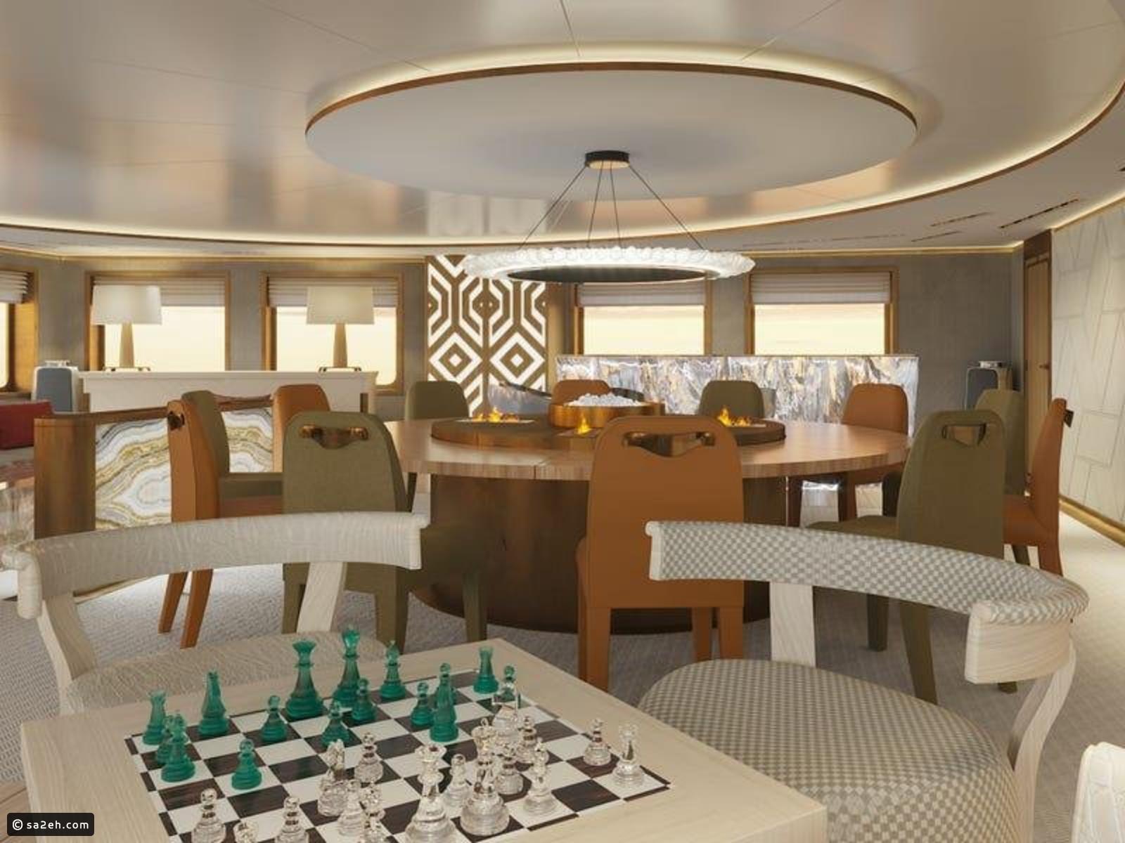وفي الداخل، زود كل جناح للضيوف بحمام خاص وخزانة ملابس، كما يوجد على متنه حمامان للبخار وقاعة للألعاب البدنية وغرفة للتدليك ومصعد زجاجي للتنقل بين طوابقه.