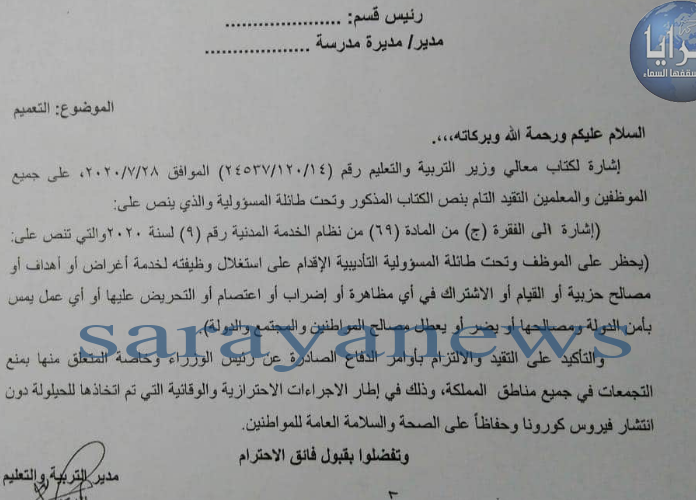 وحسب الكتاب الذي يحمل الرقم 14/120/24537 تاريخ 28/7/2020 ووصل لـ"سرايا" بأنه على جميع الموظفين التقيد التام والالزامي تحت طائلة المسائلة التأديبية ، اشارة الى الفقرة ج من المادة 69 من نظام الخدمة المدنية رقم لسنة 2020 والتي تنص على أنه يحظر على الموظف وتحت طائلة المسؤولية التأديبية الاقدام على استغلال وظيفته لخدمة اغراض او اهداف او مصالح حزبية او القيام بالاشتراك بأي مظاهرة او اضراب او اعتصام او التحريض عليها او اي عمل يمس بأمن الدولة ومصالحها او يضر او يعطل مصالح المواطنين والمجتمع والدولة.