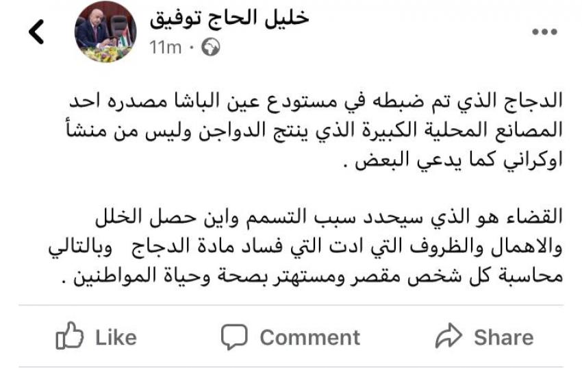 وقال الحاج توفيق في منشور له عبر فيسبوك إن القضاء هو الذي سيحدد سبب التسمم واين حصل الخلل والاهمال والظروف التي ادت التي فساد مادة الدجاج وبالتالي محاسبة كل شخص مقصر ومستهتر بصحة وحياة المواطنين.