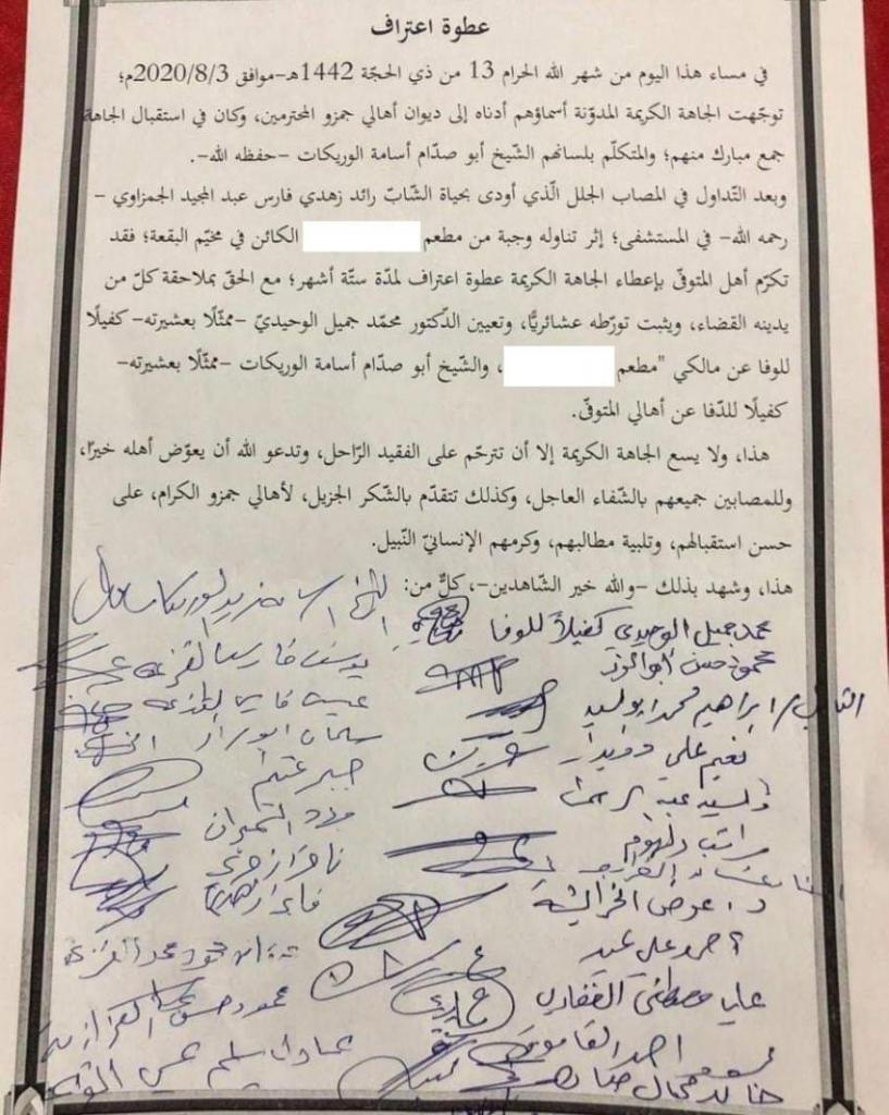و اشترطت العطوة الاحتفاظ بحق ملاحقة كل من يدينه القضاء ويثبت تورطه بهذه القضية عشائريا.