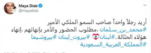 وقالت مايا دياب في تغريدة عبر حسابها بموقع (تويتر): "أريد رجلاً واحداً صاحب السمو الملكي الأمير محمد بن سلمان، مطلوب الحضور، والأمر بإنهائهم، إنهاء هؤلاء الحثالة".