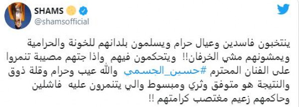 وأضافت شمس: "ينتخبون فاسدين وعيال حرام ويسلمون بلدانهم للخونة والحرامية ويمشونهم مشي الخرفان!! ويتحكمون فيهم، وإذا جتهم مصيبة تنمروا على الفنان المحترم حسين الجسمي والله عيب وحرام وقلة ذوق والنتيجة هو متوفق وثري ومبسوط والي يتنمرون عليه فاشلين وحاكمهم زعيم مغتصب كرامتهم".