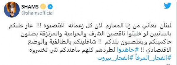 وسارعت الفنانة شمس الكويتية للرد على الهجوم عليها، بعد كتابتها منشوراً عبر حسابها بموقع (تويتر)، قالت فيه: "لبنان يعاني من زنا المحارم لان كل زعمائه اغتصبوه!!! عار عليكم يالبنانيين لو خليتوا ناقصين الشرف والحرامية والمرتزقة يضلون حاكمينكم ويغتصبون بلدكم !! شاغلينكم بالطائفية والوضع الاقتصادي !! جاهدوا لطردهم كلهم ماعندكم شي تخسروه".