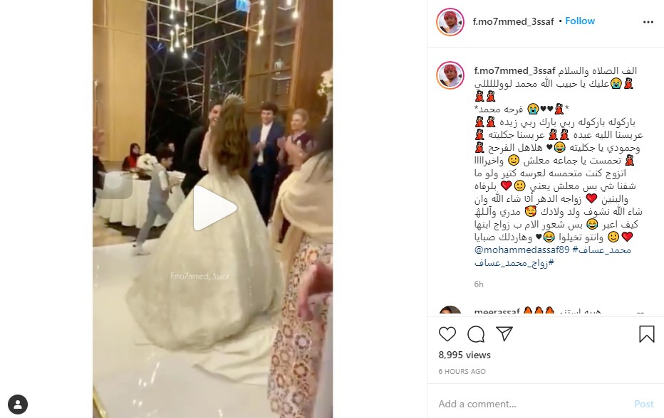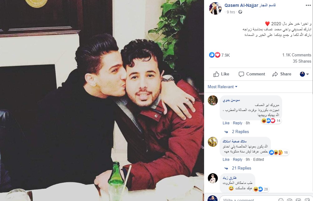 وقال قاسم النجار في تعليقه: ”وأخيرا خبر حلو بالـ2020 أبارك لصديقي وأخي محمد عساف بمناسبة زواجه بارك الله لكما وجمع بينكما على الخير والسعادة“.