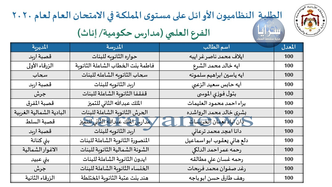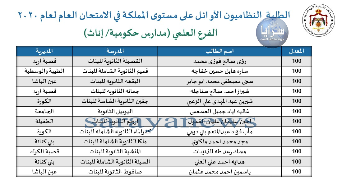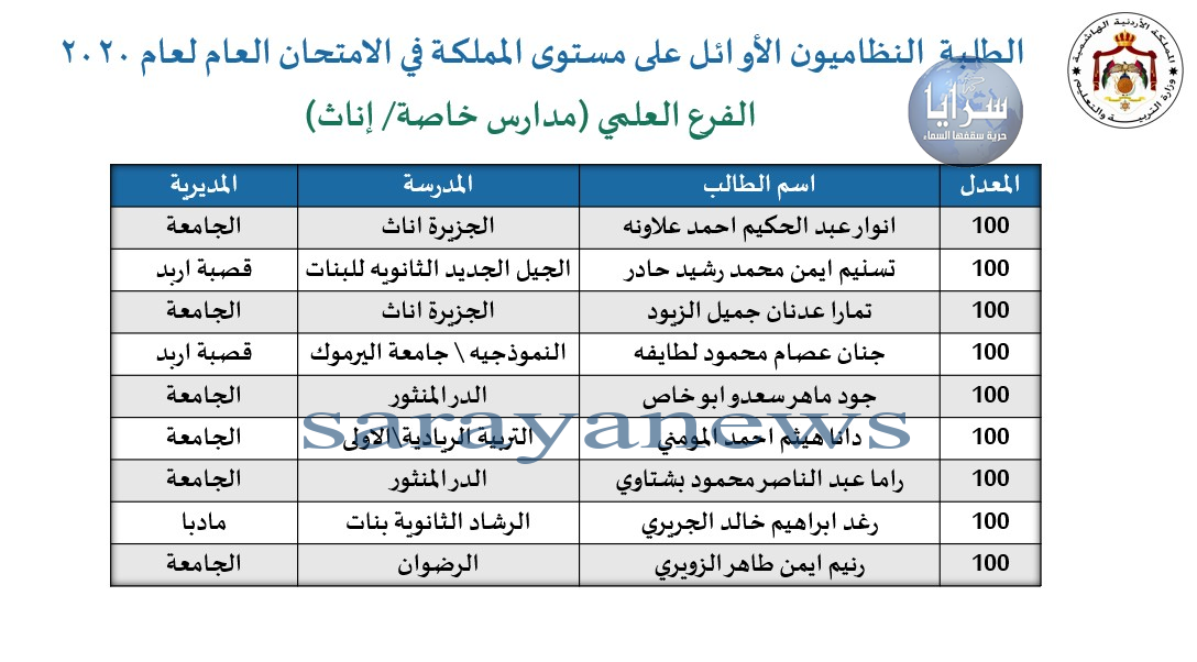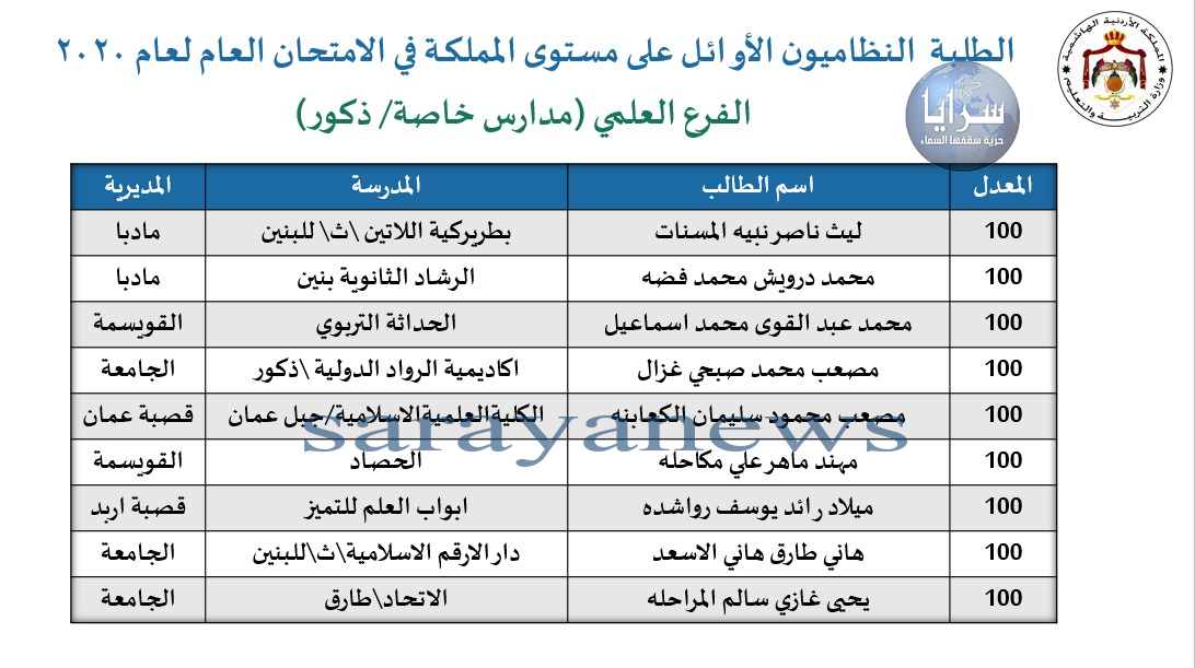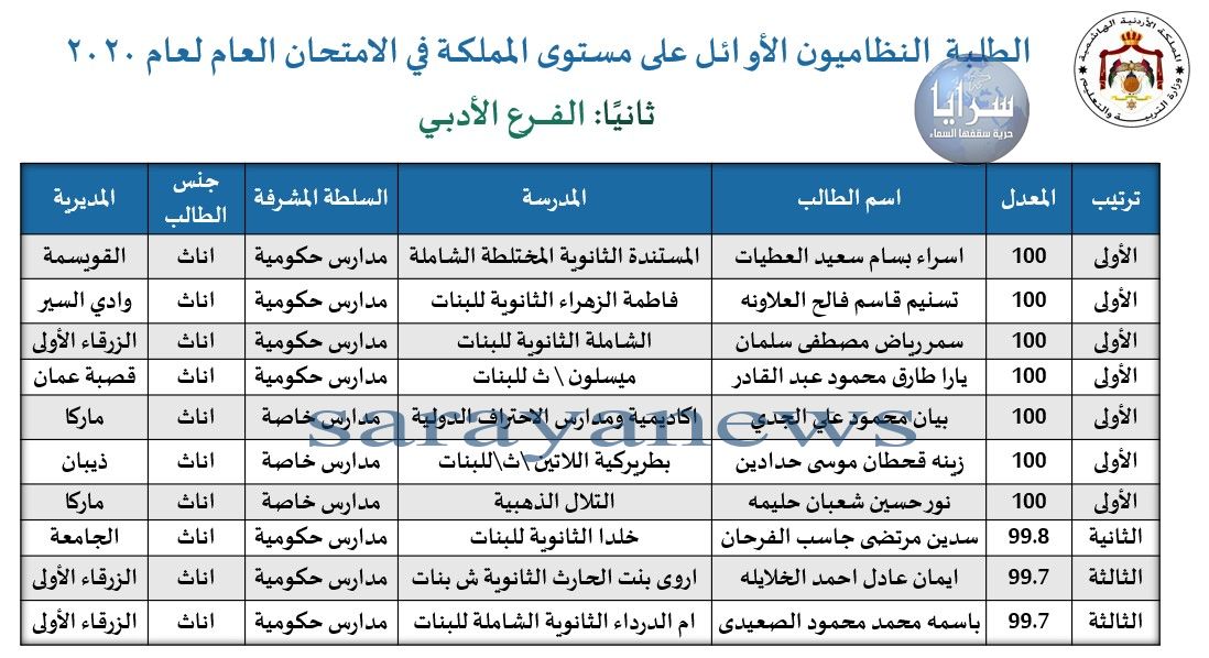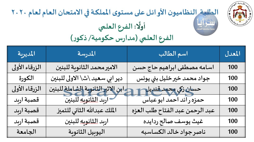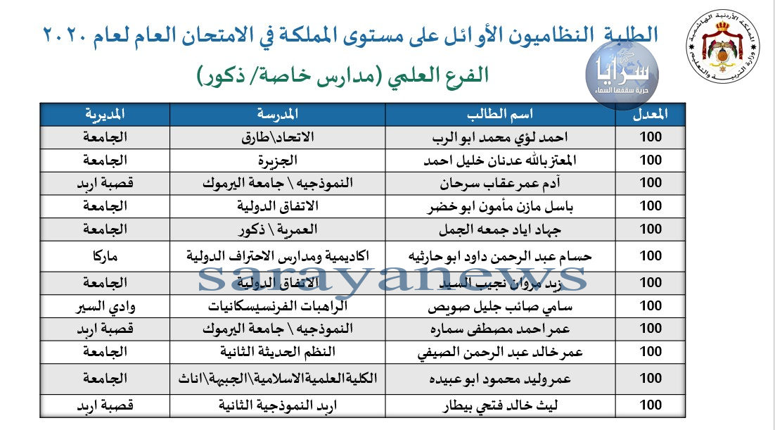 سرايا - حصل 71 طالباً وطالبة في امتحان الثانوية العامة "التوجيهي" في الفرع العلمي حققوا معدل 100%، و 7 من الطلبة في الفرع الأدبي حققوا معدل 100%".وتالياً أسماء الطلبة الأوائل على مستوى المملكة في الامتحان العام لعام 2020 :
