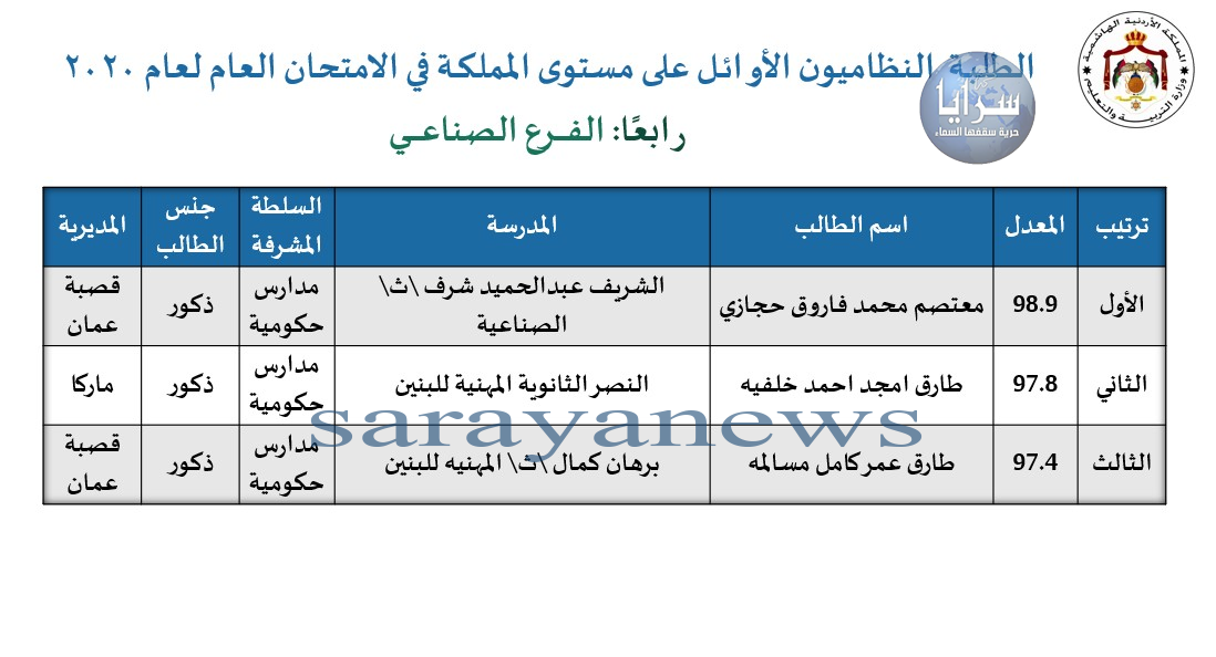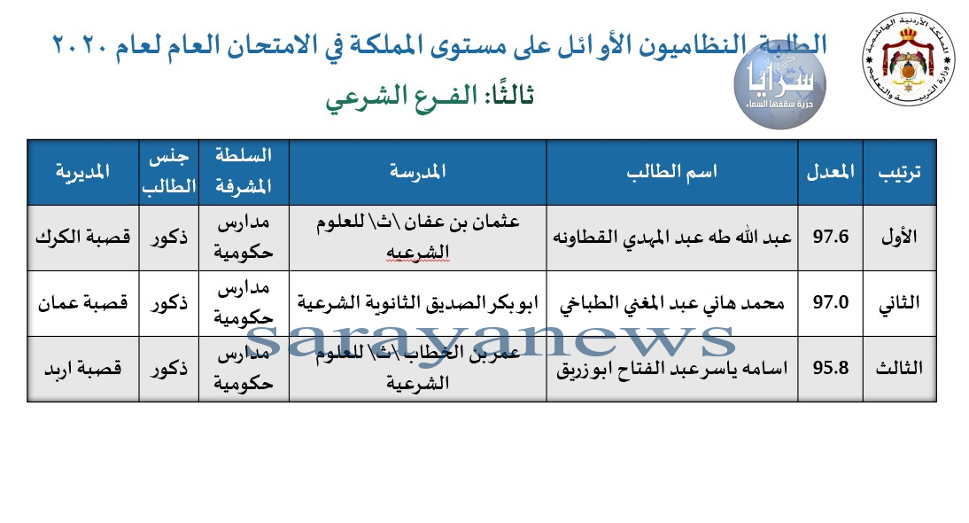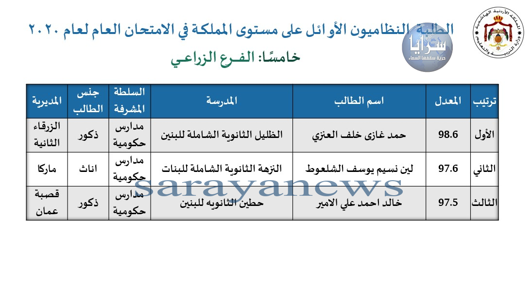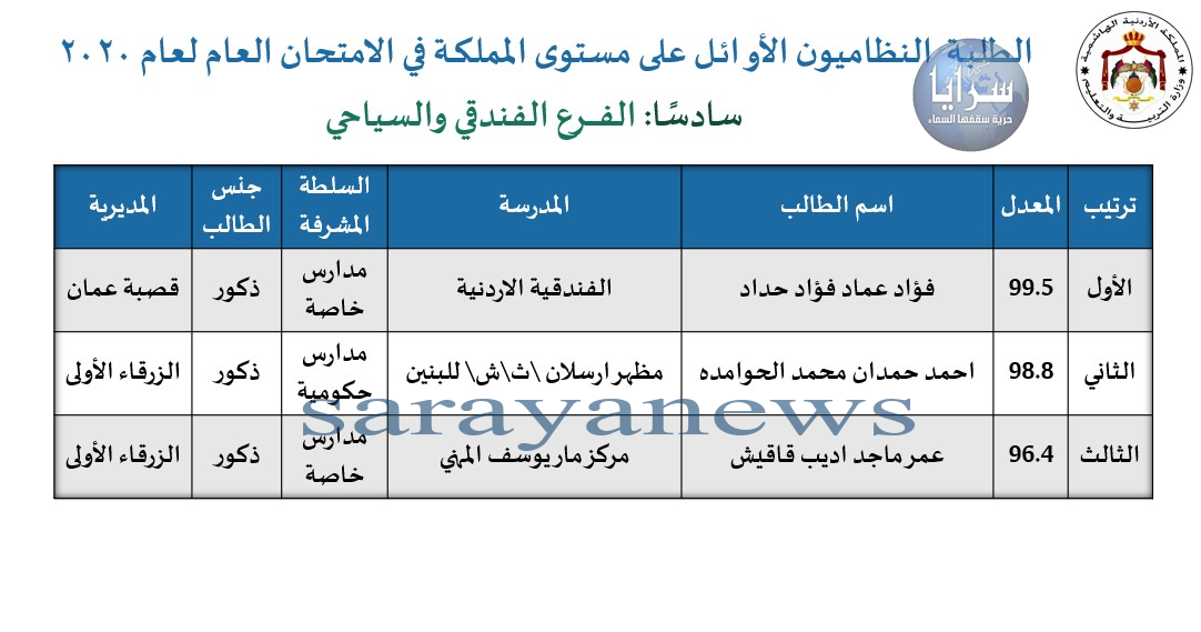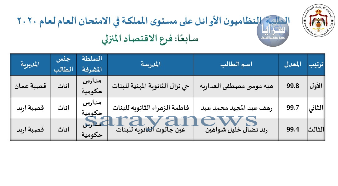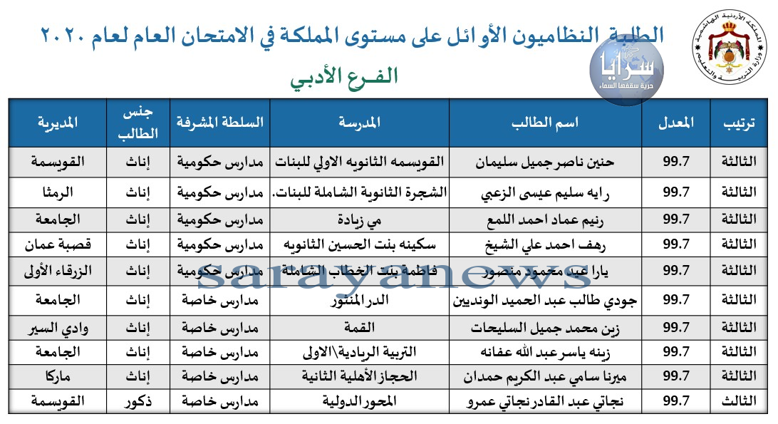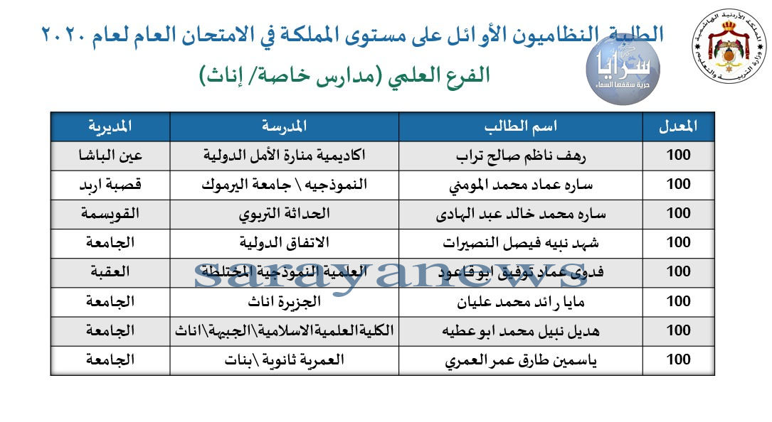 سرايا - حصل 71 طالباً وطالبة في امتحان الثانوية العامة "التوجيهي" في الفرع العلمي حققوا معدل 100%، و 7 من الطلبة في الفرع الأدبي حققوا معدل 100%".وتالياً أسماء الطلبة الأوائل على مستوى المملكة في الامتحان العام لعام 2020 :
