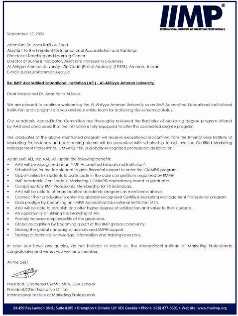 سرايا - حصل قسم التسويق في كلية الأعمال بجامعة عمان الأهلية - وللعام الثاني على التوالي - على الاعتماد الدولي لبرنامج البكالوريوس من الهيئة الدولية للمسوقين المحترفين (IIMP) ومقرها كندا، وذلك بعد ان حصل القسم على هذا الاعتماد للعام الماضي حيث كانت جامعة عمان الاهلية أول من يحصل على اعتماد دولي لبرنامج التسويق في الاردن .