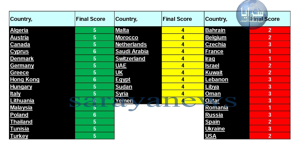 وفي التفاصيل التي تناولتها "سرايا" بالتحليل أنه قد تم حذف فلسطين من جدول التصنيف ضمن أيا من الدرجات الوبائية في حين تم ذكر "الكيان الصهيوني" علماً أن الوضع الوبائي في فلسطين أكثر استقراراً وأمنا من الكيان، وفي التصنيفات السابقة وردت ضمن القائمة الحمراء.