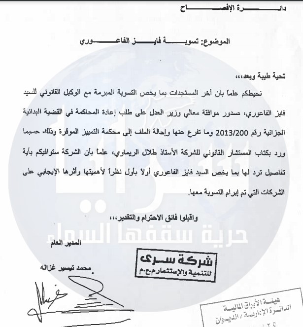 وبحسب الكتاب الذي اطلعت عليه سرايا الذي أرسلته شركة سرى للتنمية والاستثمار صاحبة الدعوى ضد الفاعوري، فإن ذلك جاء ضمن اجراءات التسوية بين الشركة و الفاعوري، مؤكدةى ان الشركة ستزود هيئة الاوراق المالية بأي تطورات بما يخص السيد فايز الفاعوري أولاً بأول نظراً لأهميتها ودورها الايجابي على الشركات التي تم إبرام التسوية معها.