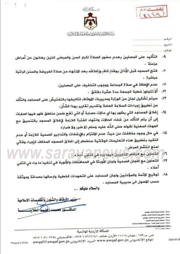 سرايا - عمم وزير الاوقاف محمد الخلايلة على مدراء الاوقاف بالإجراءات الوقائية والصحية لفتح المساجد يوم الجمعة وباقي الايام مع اخذ التعهدات الخطية والتبليغ عن أي مخالفات تصدر خلاف ذلك.