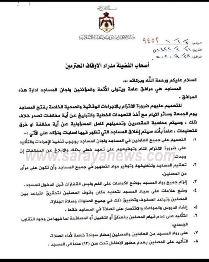 وجاء في التعميم إنه سيتم محاسبة المقصرين وتحميلهم كامل المسؤولية عن اي مخالفة أو خرق للتعليمات علماً أنه سيتم إغلاق المساجد التي تظهر فيها إصابات.