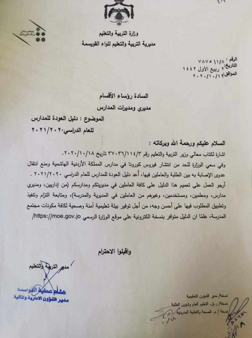 سرايا - عممت وزارة التربية والتعليم على مدراء التربية في مختلف أنحاء المملكة بضرورة الالتزام بدليل العودة للمدارس للعام الدراسي 2020/2021.