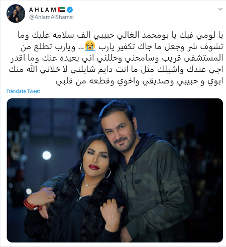 سرايا - دعمت النجمة الإماراتية أحلام، زوجها مبارك الهاجري، بعد تعرضه لوعكة صحية، دخل على أثرها إحدى المستشفيات، حيث نشرت أحلام صورة تجمعها بزوجها، وعلقت عليها: (يا لومي فيك يا بومحمد الغالي حبيبي ألف سلامه عليك وما تشوف شر وجعل ما جاك تكفير يارب .. ويارب تطلع من المستشفى قريب وسامحني وحللني اني بعيده عنك وما اقدر اجي عندك واشيلك مثل ما انت دايم شايلني لا خلاني الله منك ابوي و حبيبي وصديقي واخوي وقطعه من قلبي).