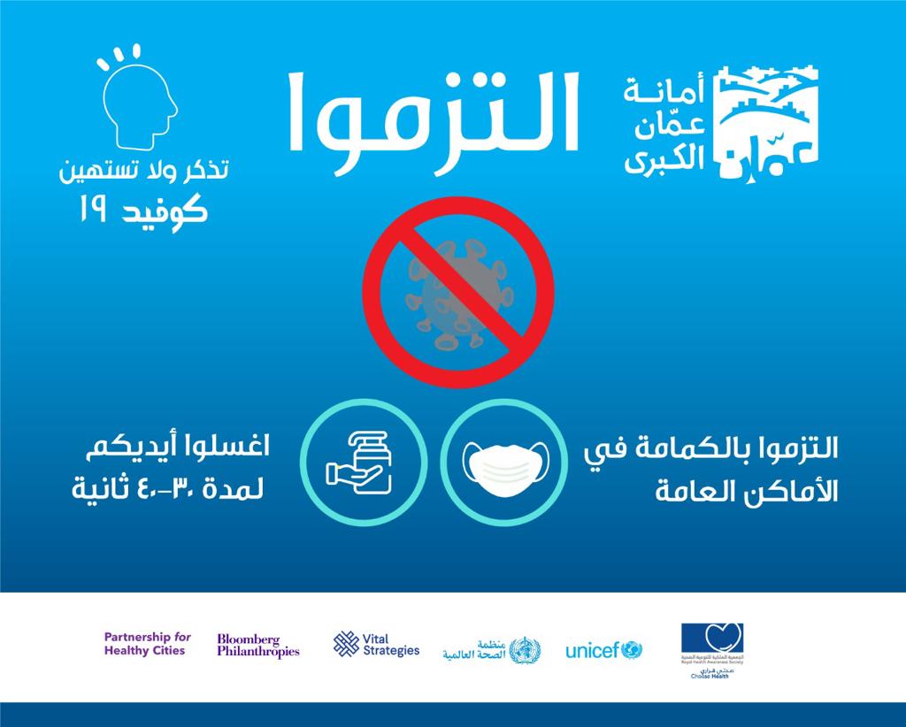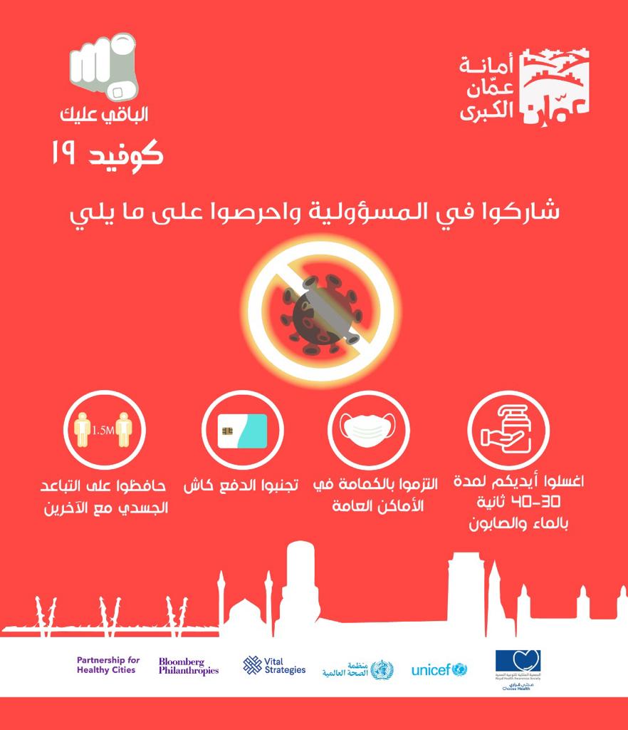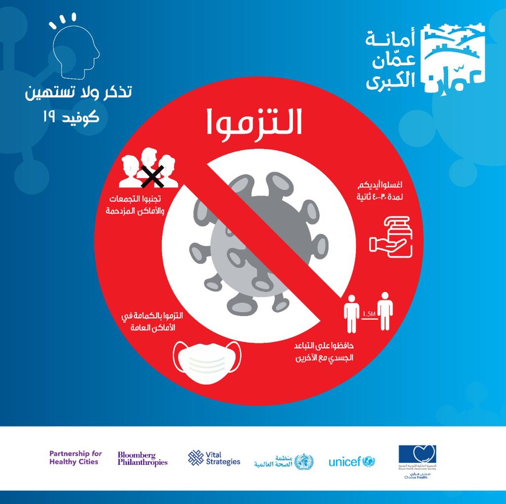 سرايا - اطلقت أمانة عمان الكبرى، اليوم الثلاثاء، حملة للتوعية بفيروس كورونا تحت شعار (لصحتك .. تذكر ولا تستهين والباقي عليك) بالشراكة مع المدن الصحية، ومنظمة الصحة العالمية والمنظمة العالمية، بالإضافة الى منظمة اليونيسف والجمعية الملكية للتوعية الصحية.