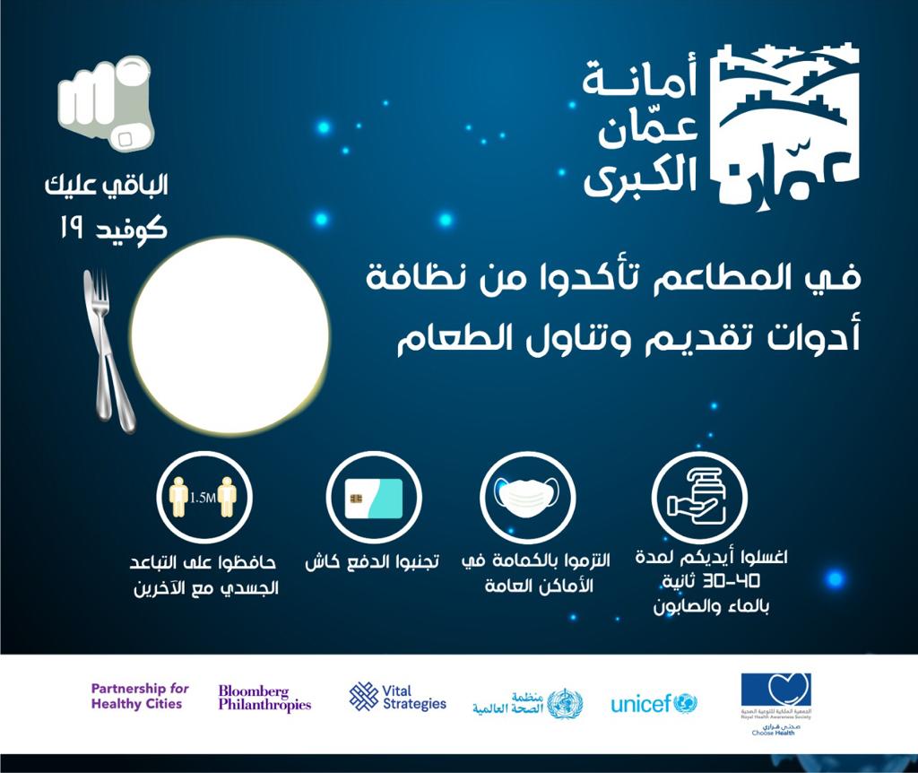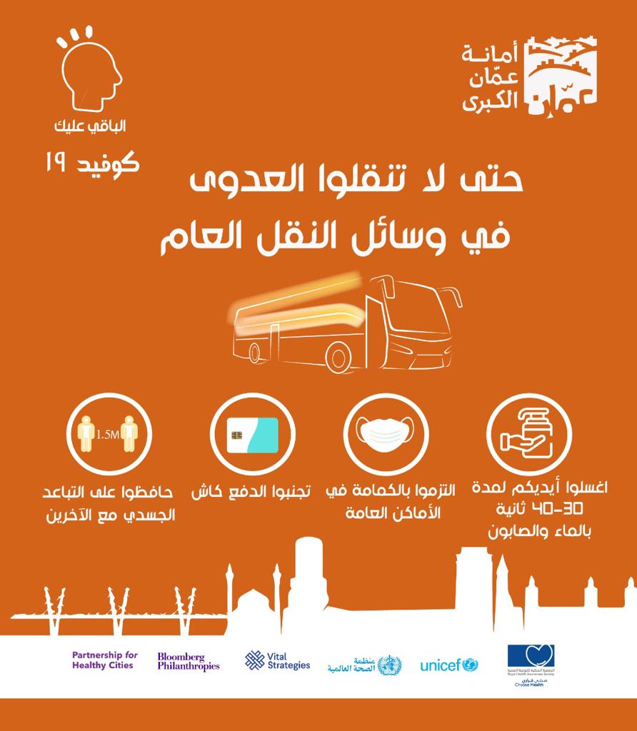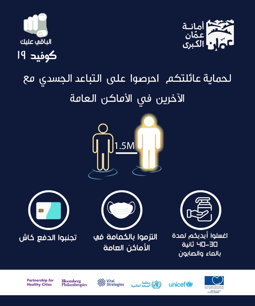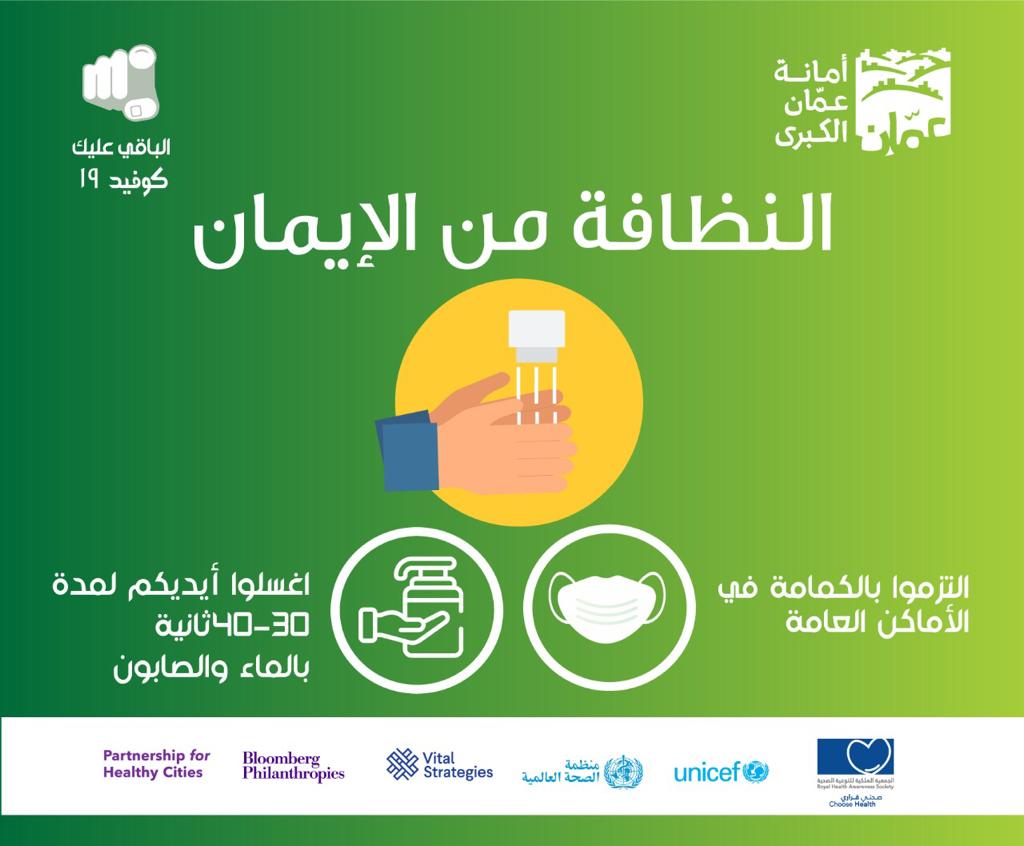 سرايا - اطلقت أمانة عمان الكبرى، اليوم الثلاثاء، حملة للتوعية بفيروس كورونا تحت شعار (لصحتك .. تذكر ولا تستهين والباقي عليك) بالشراكة مع المدن الصحية، ومنظمة الصحة العالمية والمنظمة العالمية، بالإضافة الى منظمة اليونيسف والجمعية الملكية للتوعية الصحية.