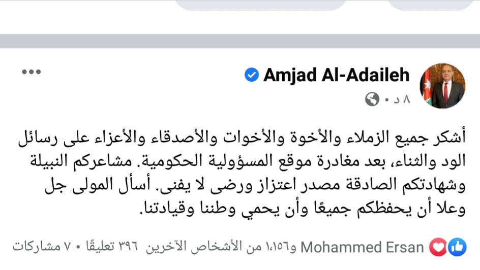 سرايا - قال وزير الاعلام السابق امجد العضايلة، عبر حسابه بتويتر: "أشكر جميع الزملاء والأخوة والأخوات والأصدقاء والأعزاء على رسائل الود والثناء، بعد مغادرة موقع المسؤولية الحكومية.