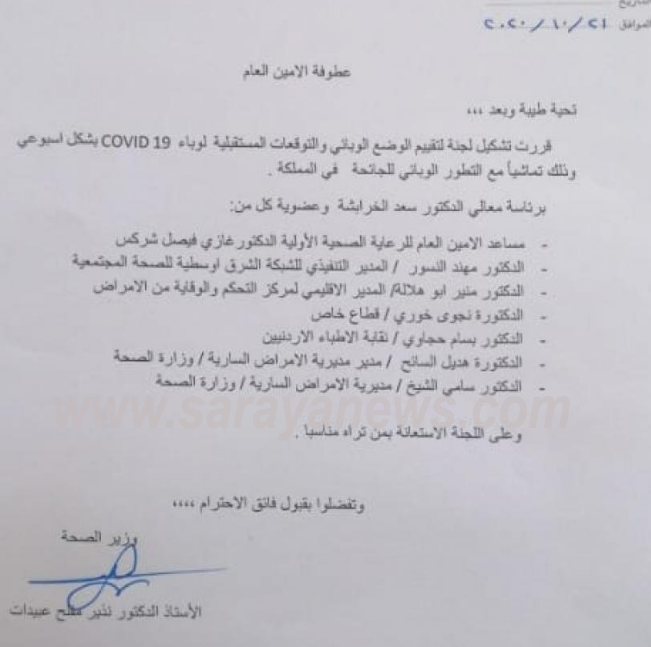 سرايا - قرر وزير الصحة الدكتور نذير عبيدات اليوم الأربعاء تشكيل لجنة لتقييم الوضع الوبائي والتوقعات المستقبلية لوباء كوفيد 19، بشكل أسبوعي، وذلك تماشياً مع التطور الوبائي للجائحة في المملكة.