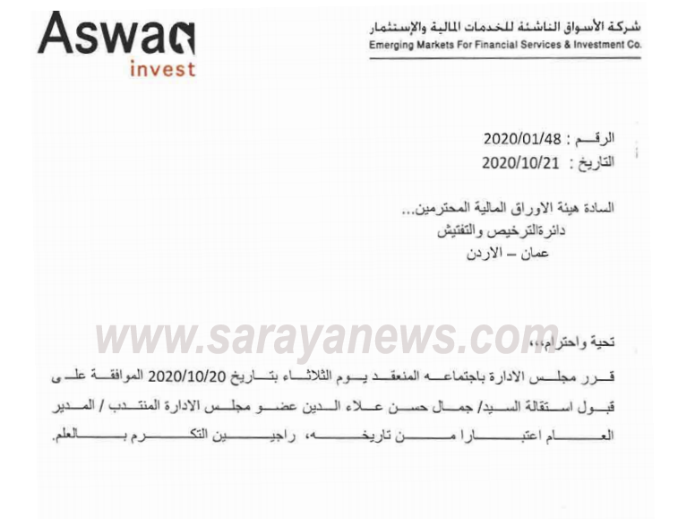سرايا - خاص - استقال المدير العام لشركة الاسواق الناشئة للخدمات المالية والاستثمار من منصبه، وفق الكتاب الذي اطلعت عليه سرايا.