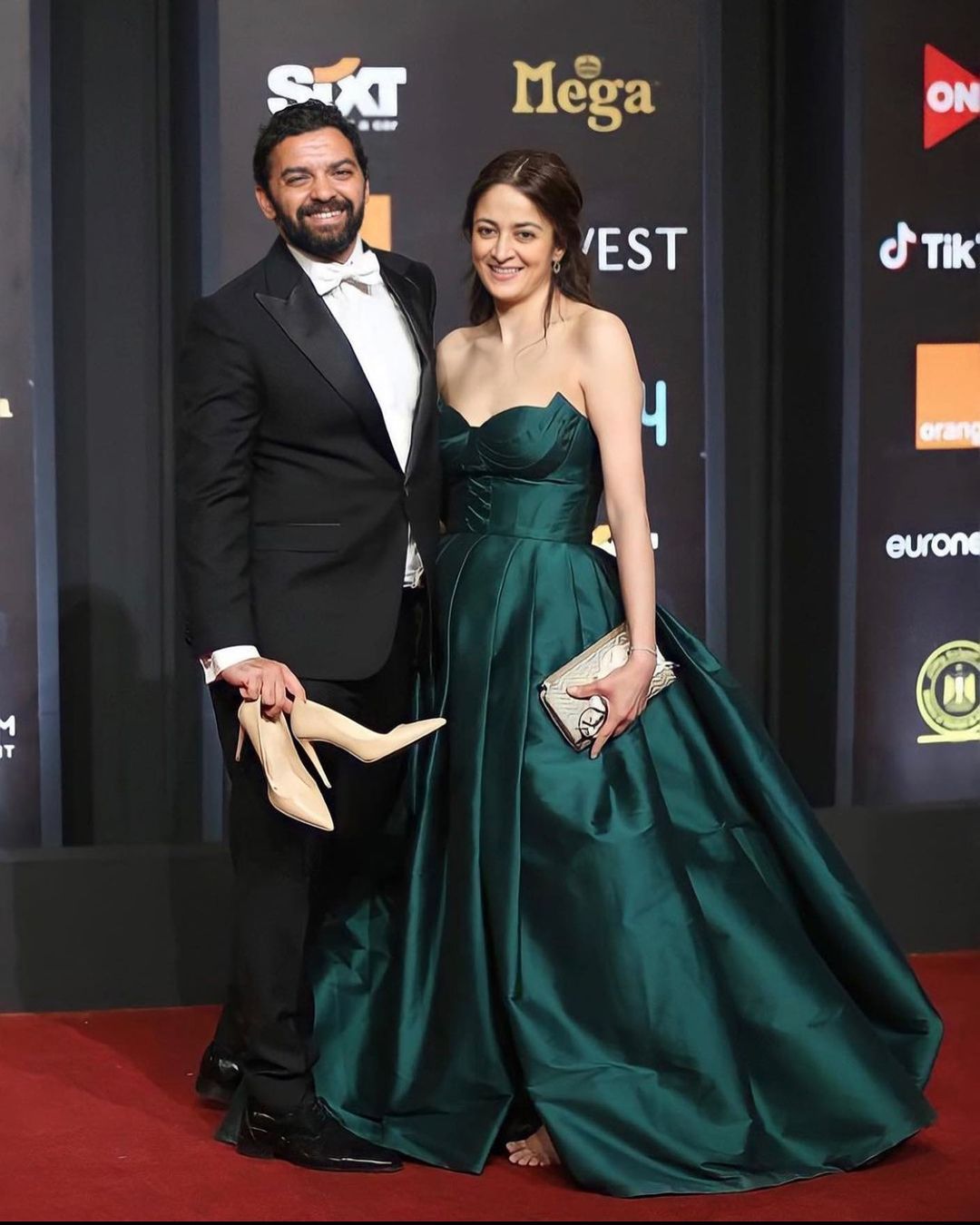 وأطلت ياسمين، بفستان أخضر داكن اللون وعاري الكتفين، وتركت شعرها منسدلا للخلف، بينما ارتدي خضر الملابس الرسمية لمهرجان الجونة.