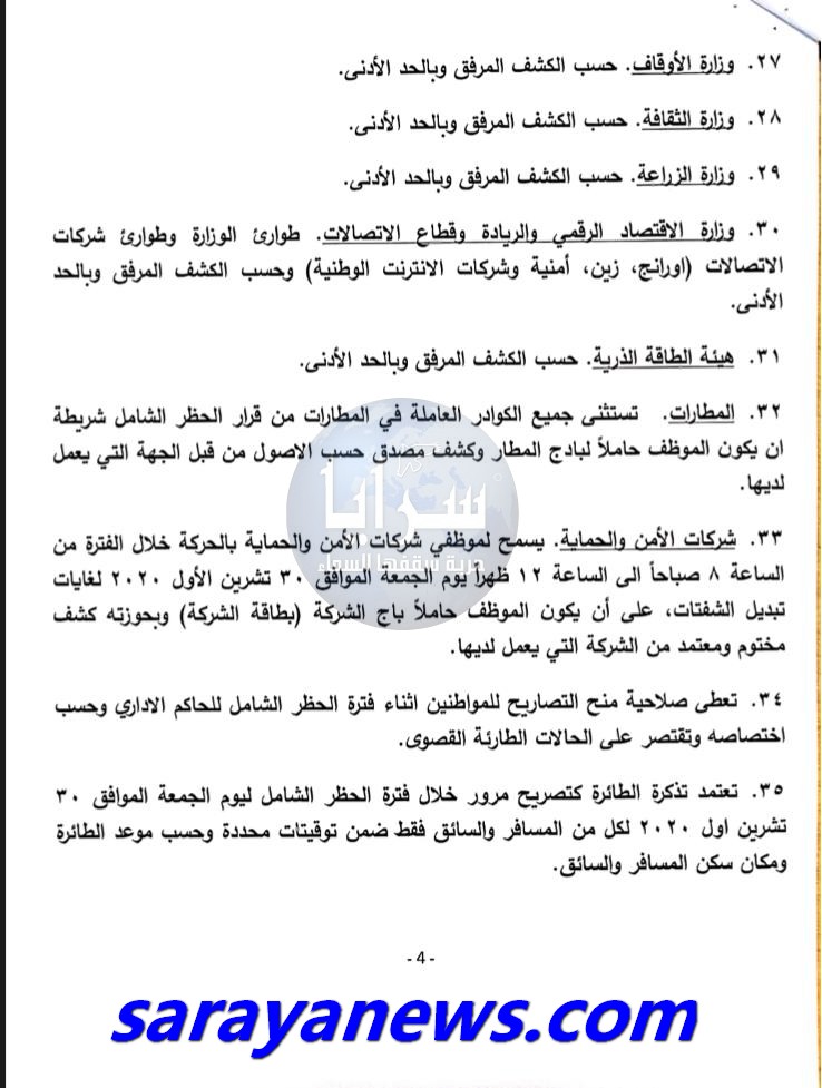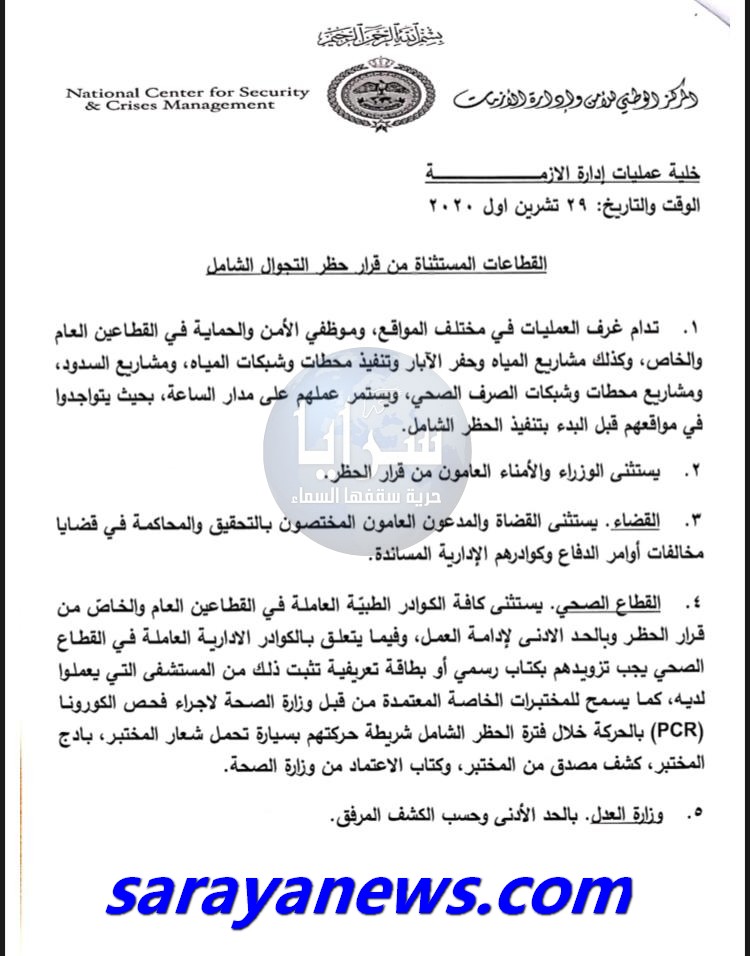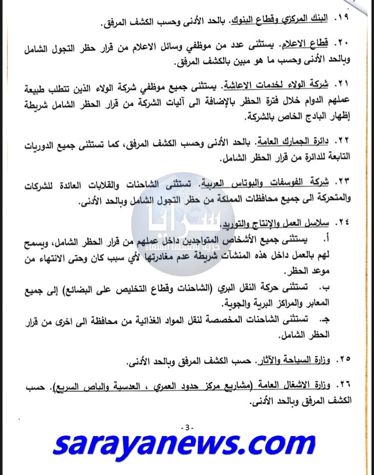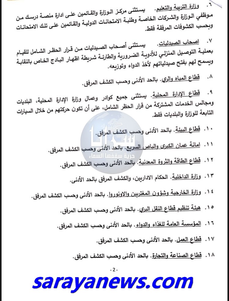 و بحسب وثائق وصلت لـ"سرايا" تم استثناء 43 قطاعاً و "فئة" منها القطاع الطبي و القضائي و التربوي و غيره، و تالياً القطاعات المستثناة من الحظر الشامل: