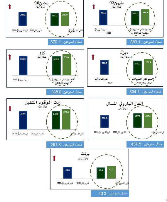 بالمقابل، استمر سعر الغاز البترولي المسال لشهر تشرين الثاني عند 5ر437 دولار للطن مقارنة مع سعره المسجل في شهر تشرين أول الماضي والذي بلغ 8ر378 دولار .